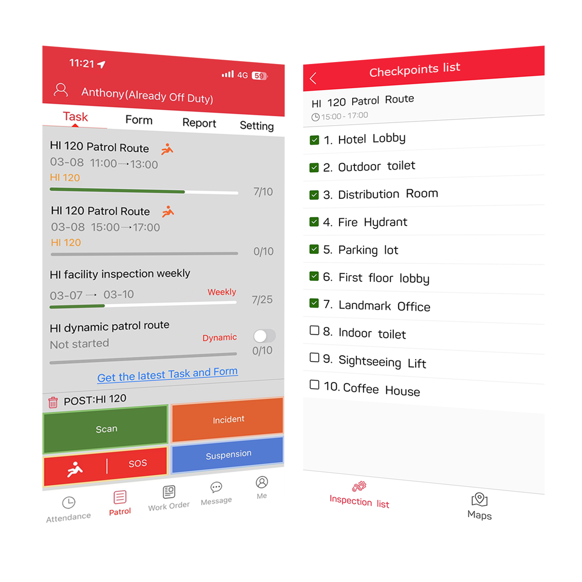 The form will be opened automatically when the employee scans the checkpoints. The user-defined form can include: description, question, option, form, photo, signature and other 30+elements to remind the employee what to do, how to do and multiple inspection items to avoid patrol without inspection!